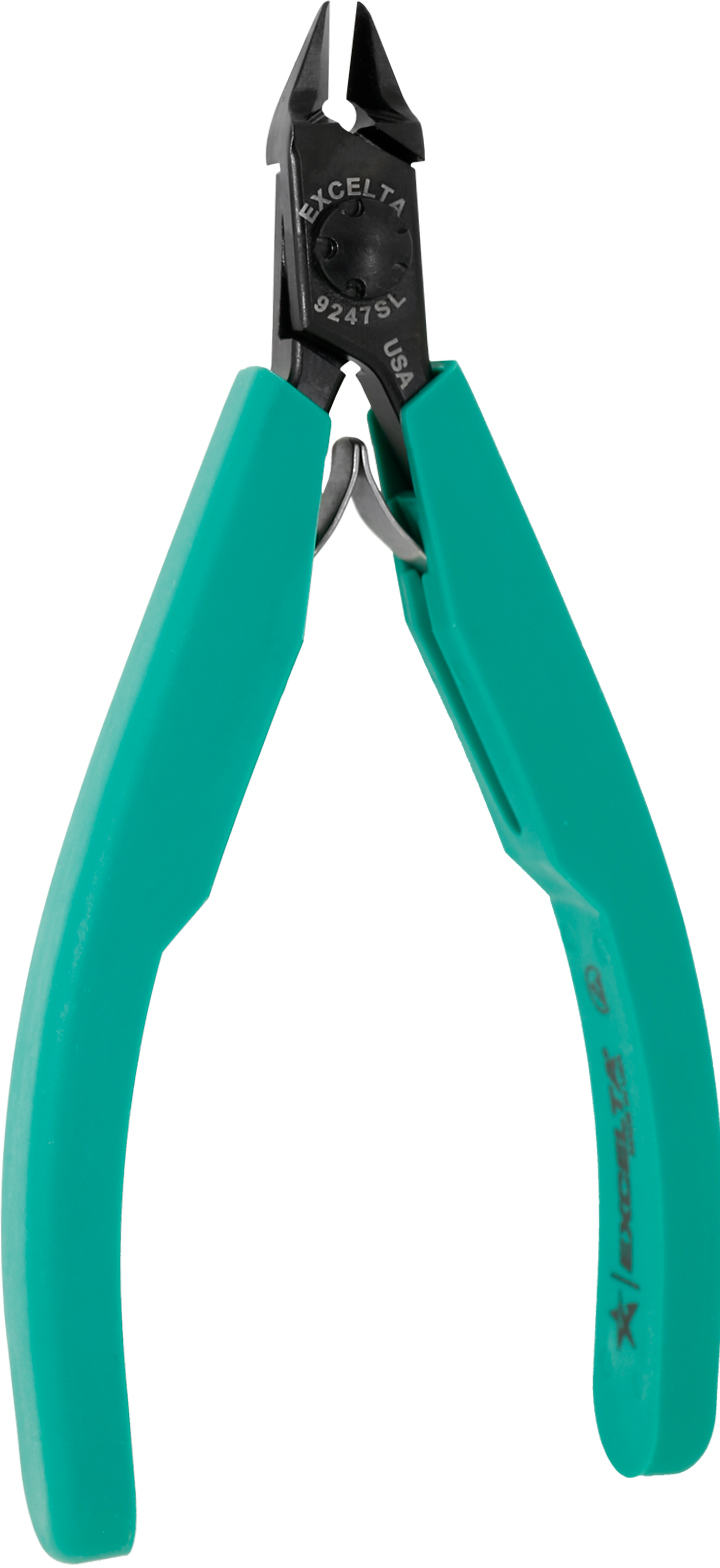 The Slim Line 9247SL optimum flush new and improved Lazer Line? medium SLIM LINE tapered/relieved head cutters feature BLACK OXIDE FINISH and a smaller frame with new molded grip. They are made of AISI 52/100 carbon tool steel with induction hard cutting blades to RHC 63-65. The CNC machining allows the joint surfaces to be perfect to allow for long life. The dual leaf springs provide a smooth action. It features molded ergonomic antimicrobial Anti-Static grips (10??ohms/sq surface resistivity).