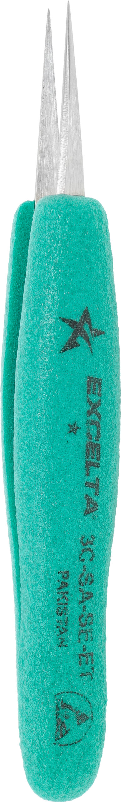 The 3C-SA-SE-ET straight very fine precision pointed tweezer is designed for work under magnification. The overall length is 4.75″ and its made of anti-magnetic stainless steel. It features our Ergo-Tweeze? soft cushioned Anti-Static grips (10?? ohms/sq surface resistivity), which also protect the user from heat.