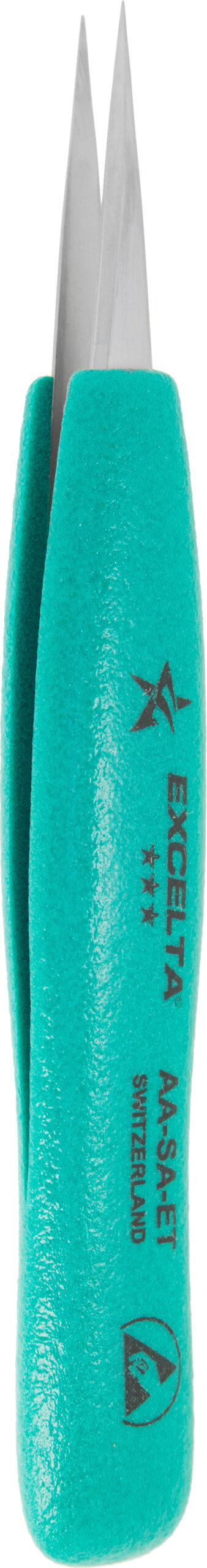 The AA-SA-ET straight medium point 5.5″ general purpose tweezer is made of AISI 303/304 anti-magnetic Neverust? stainless steel which prevents oxidation. It features our Ergo-Tweeze? soft cushioned Anti-Static grips (10?? ohms/sq surface resistivity), which also protect the user from heat.