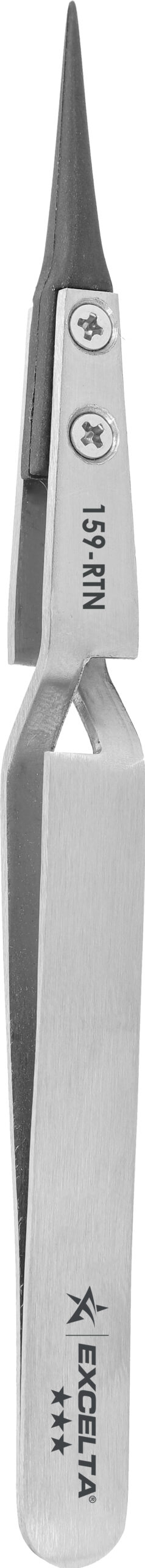 The 159-RTN reverse action soft replaceable tip tweezer is 5″ long with .012″ wide tips. The Carbofib? tips are a polymer based material with 30% carbon fibers added (conductive 10? ohms/sq). Carbofib? has very high rigidity, excellent tensile and flexural strength, fatigue and creep resistance, and temperature resistant to 249?F. Carbofib? is a polymer based material with 30% carbon fibers added (conductive 10? ohms/sq). The bodies are made of anti-magnetic Neverust? stainless steel (AISI 316L). They are excellent for handling delicate items.