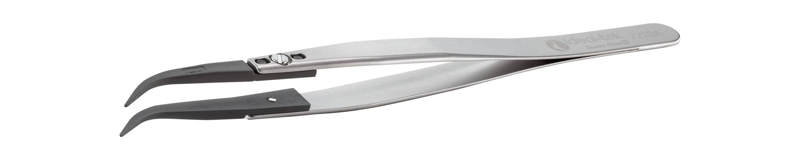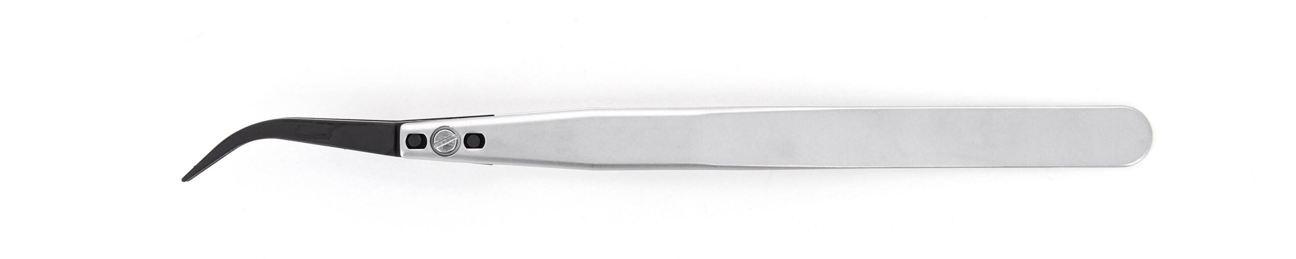 Type 7ZJ Ceramic replaceable tip tweezers are suitable to applications which require holding a small component firmly. The curved geometry provides maximum visibility and increased ergonomics. The ESD Ceramic tips provide the tweezers with outstanding resistance to high temperatures and aggressive environments combined with exceptional hardness.