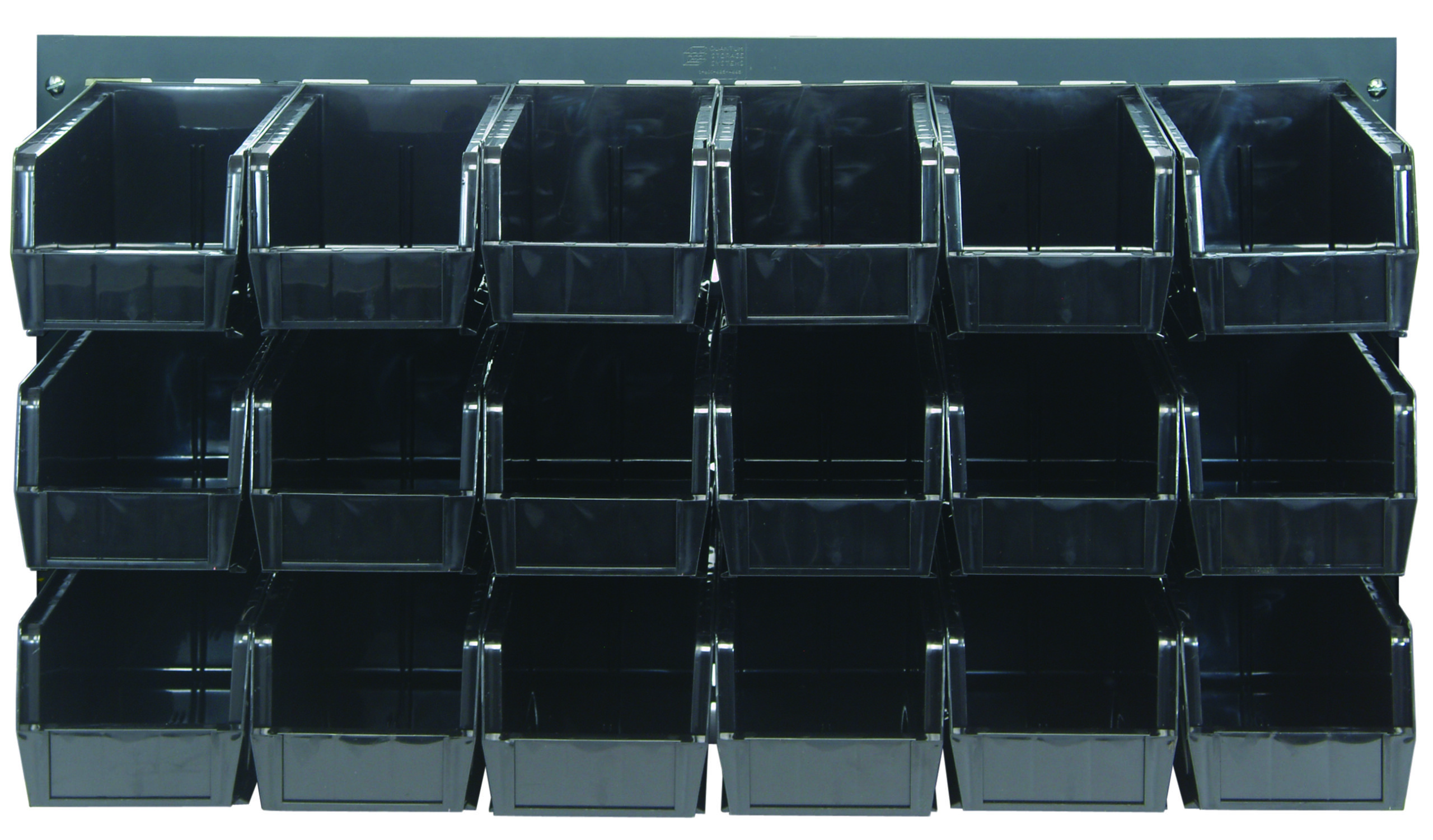 Louvered Panel, wall mounted, 36″L x 11″D x 19″H, includes: (18) QUS230, black bins, heavy-duty 16 gauge cold rolled steel, gray enamel coated finish (mounting hardware not included)