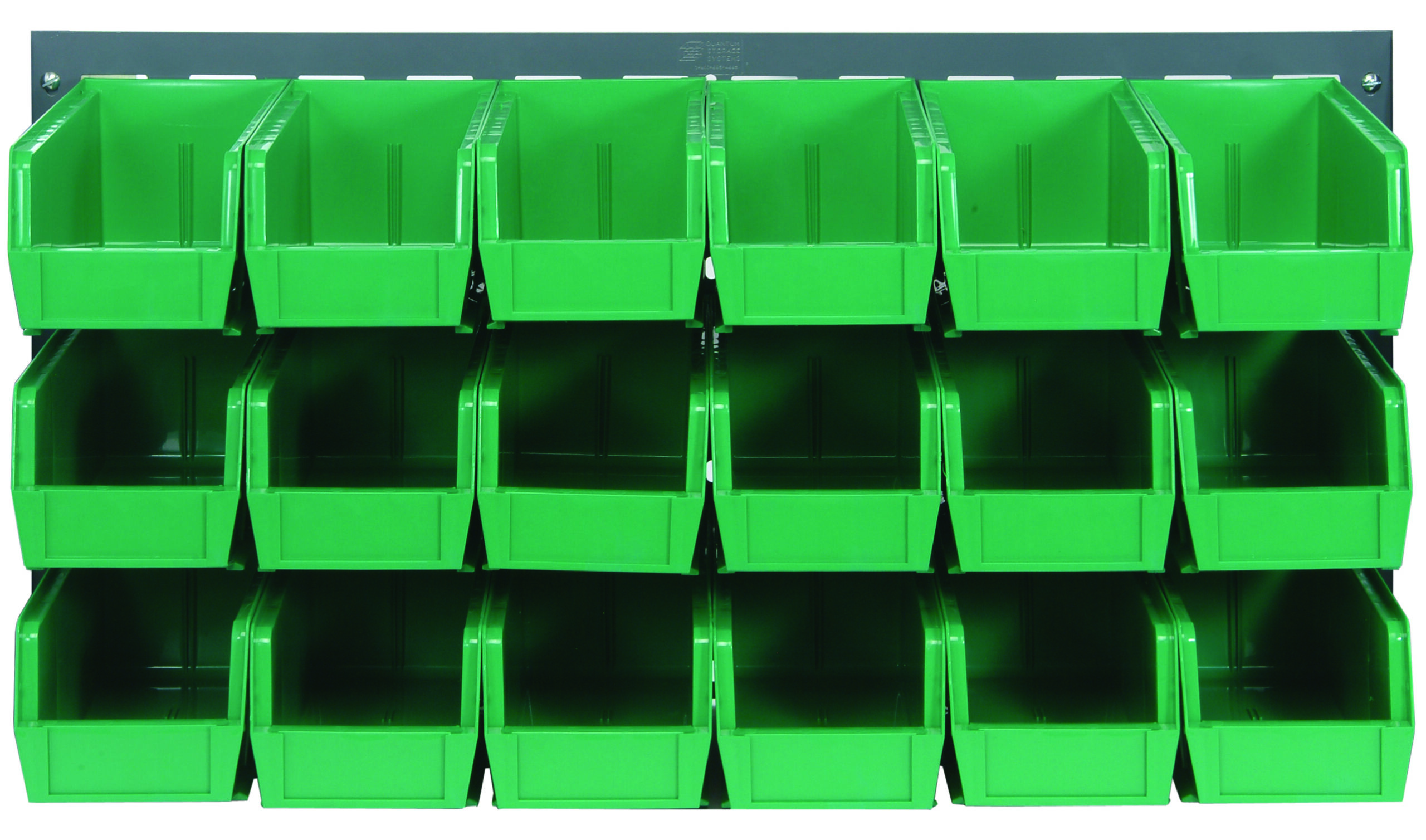 Louvered Panel, wall mounted, 36″L x 11″D x 19″H, includes: (18) QUS230, clear bins, heavy-duty 16 gauge cold rolled steel, gray enamel coated finish (mounting hardware not included)