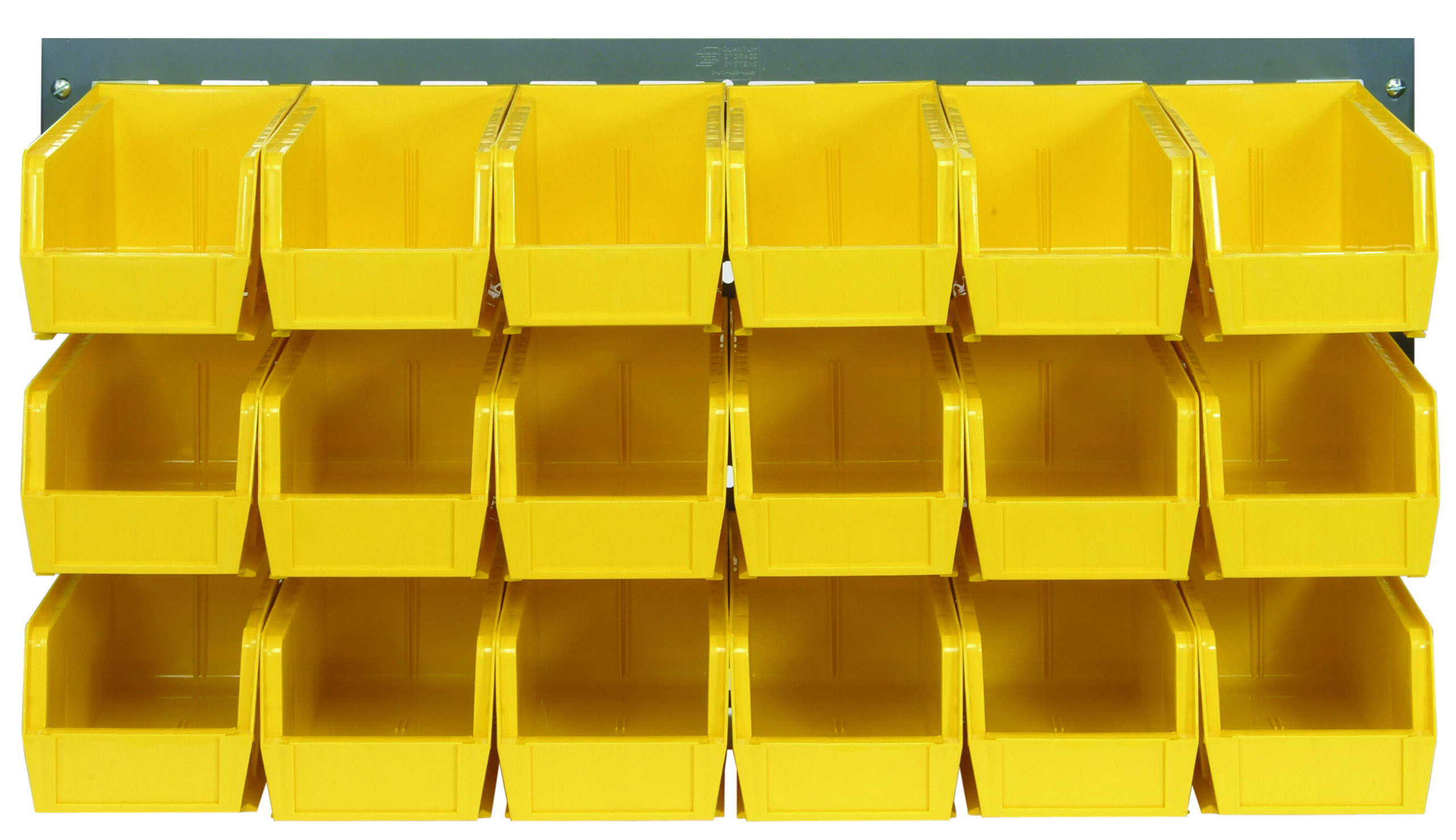 Louvered Panel, wall mounted, 36″L x 11″D x 19″H, includes: (18) QUS230, clear bins, heavy-duty 16 gauge cold rolled steel, gray enamel coated finish (mounting hardware not included)
