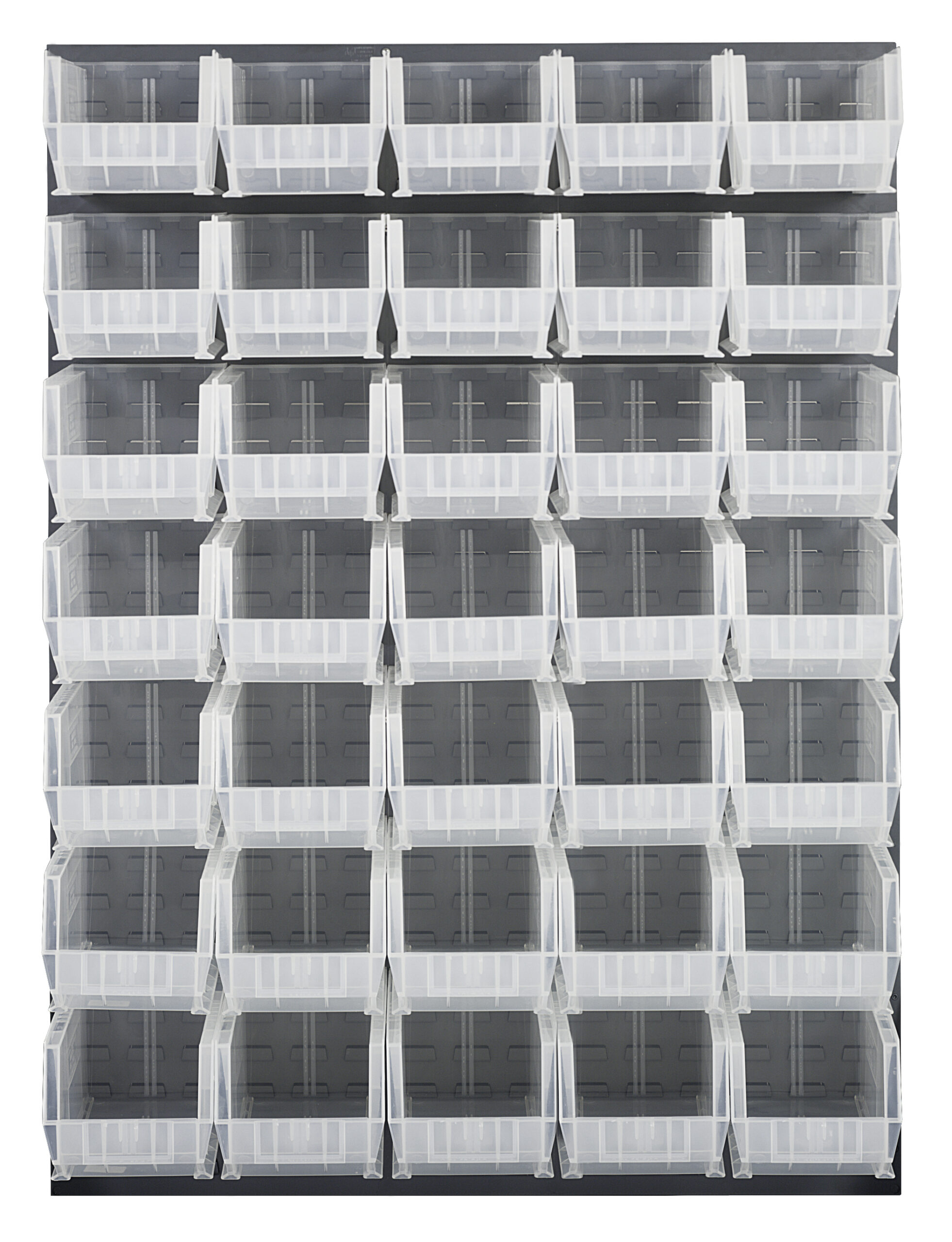 Louvered Panel, wall mounted, 48″L x 15″D x 61″H, includes: (35) QUS240, clear bins, heavy-duty 16 gauge cold rolled steel, gray enamel coated finish (mounting hardware not included)