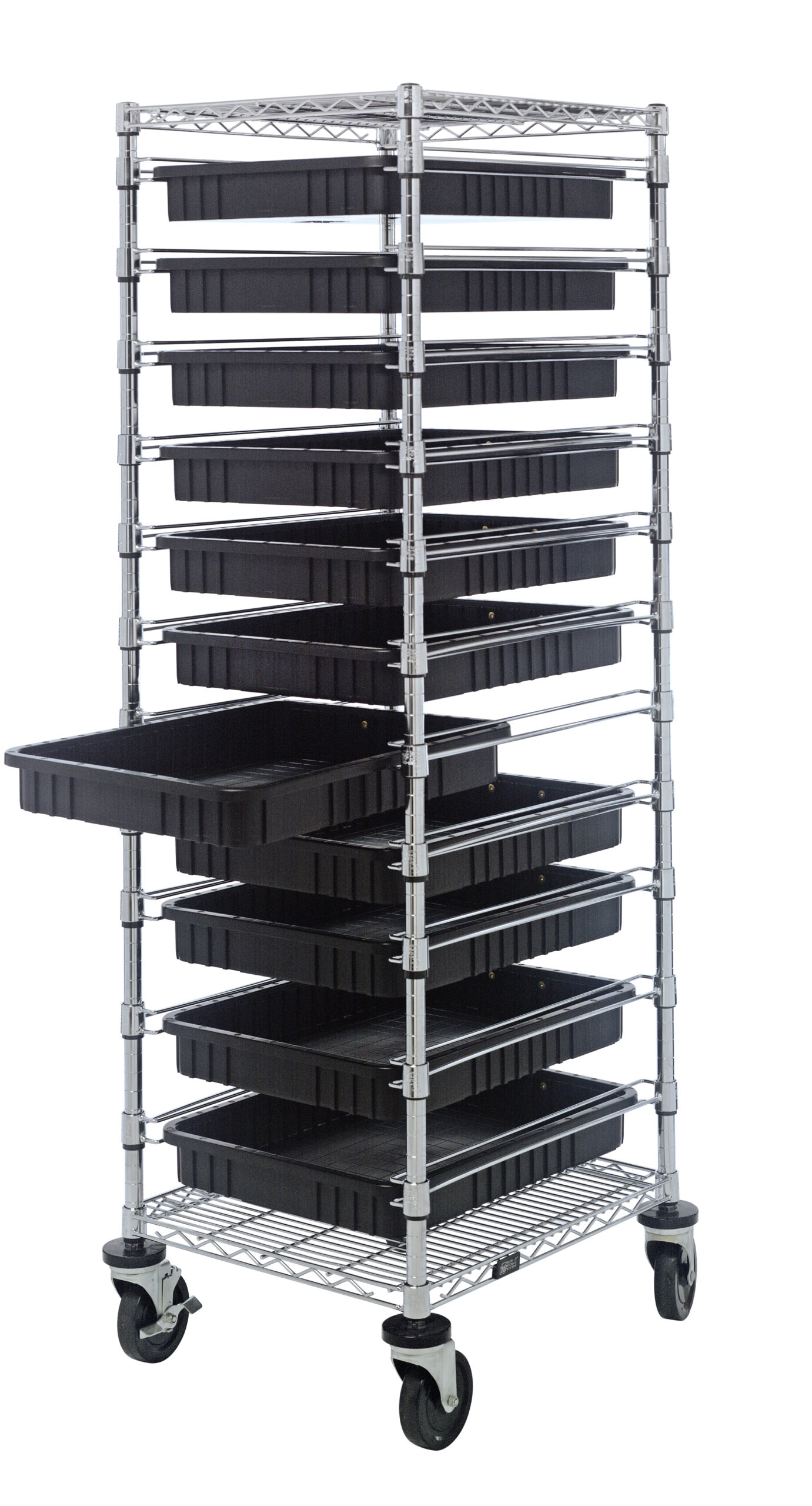 Bin Cart, mobile, conductive, 21″W x 24″L x 69″H, includes: (2) wire shelves, (11) 22-1/2″L x 17-1/2″W x 3″H (DG93030) black bin and set of casters, chrome plated finish
