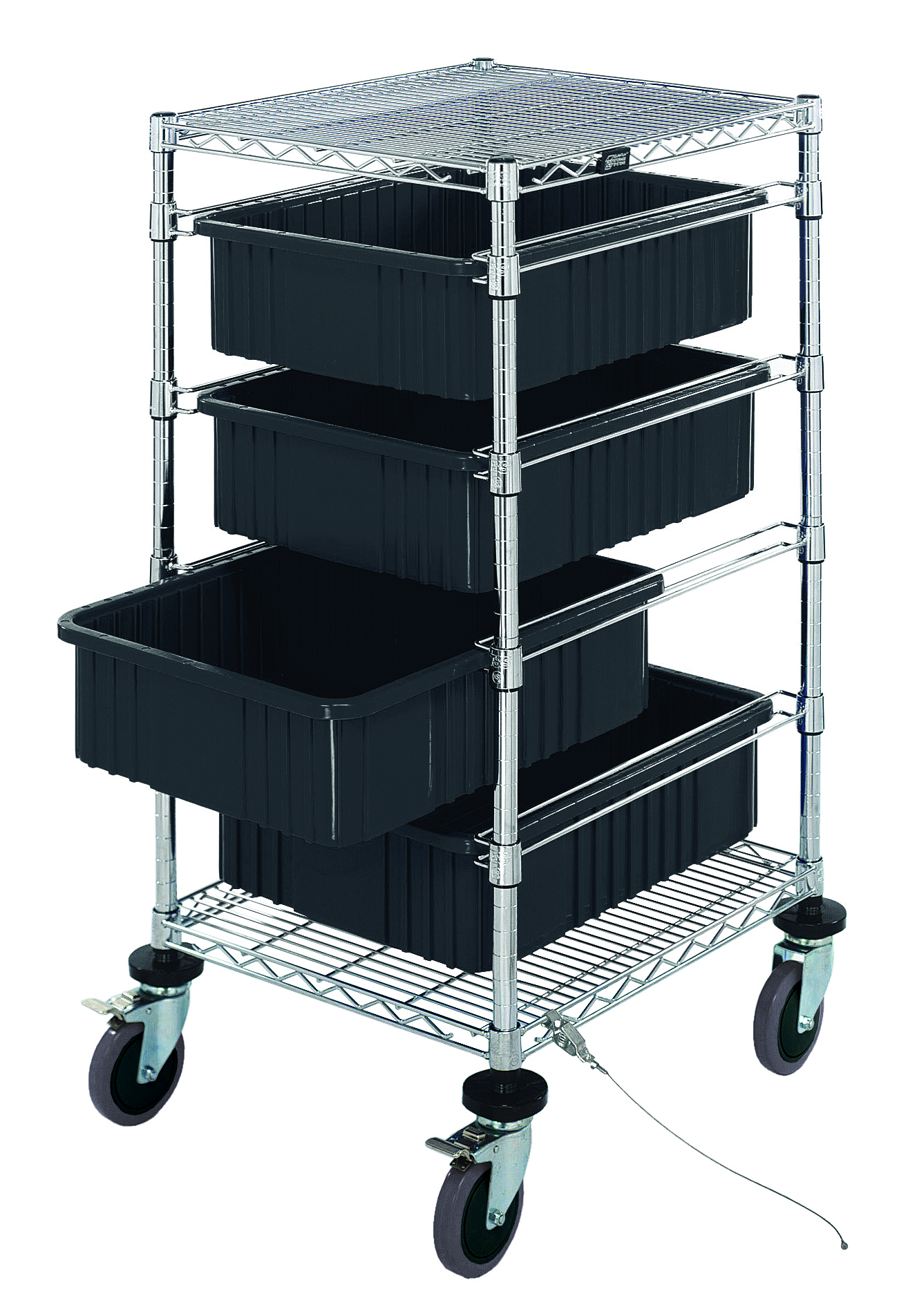 Bin Cart, mobile, conductive, 21″W x 24″L x 45″H, includes: (2) wire shelves, (4) 22-1/2″L x 17-1/2″W x 6″H (DG93060) black bin and set of casters, chrome plated finish