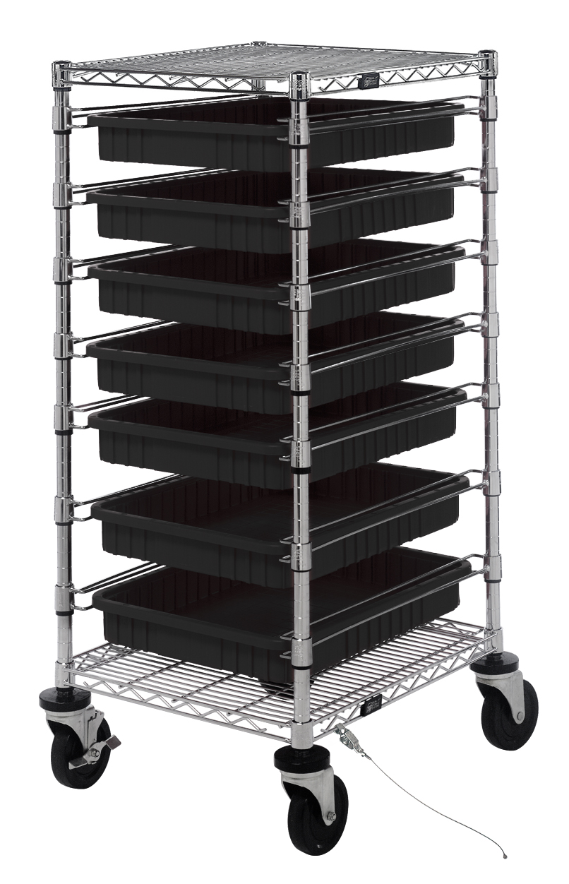 Bin Cart, mobile, conductive, 21″W x 24″L x 45″H, includes: (2) wire shelves, (7) 22-1/2″L x 17-1/2″W x 3″H (DG93030) black bin and set of casters, chrome plated finish
