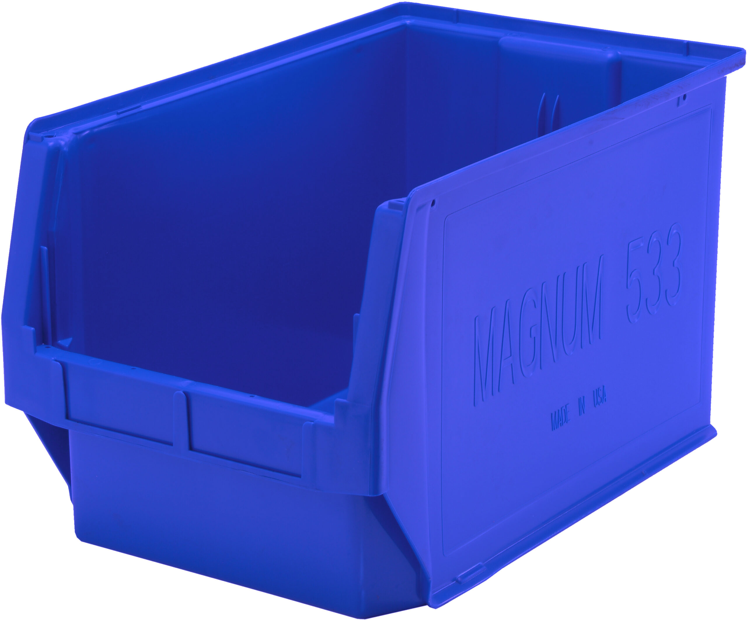 Magnum Bin, 19-3/4″L x 12-3/8″W x 11-7/8″H, 150 lbs. stack capacity, high density polypropylene, imprevious to most solvents, corrosion, rust and rot resistant, blue, Made in USA