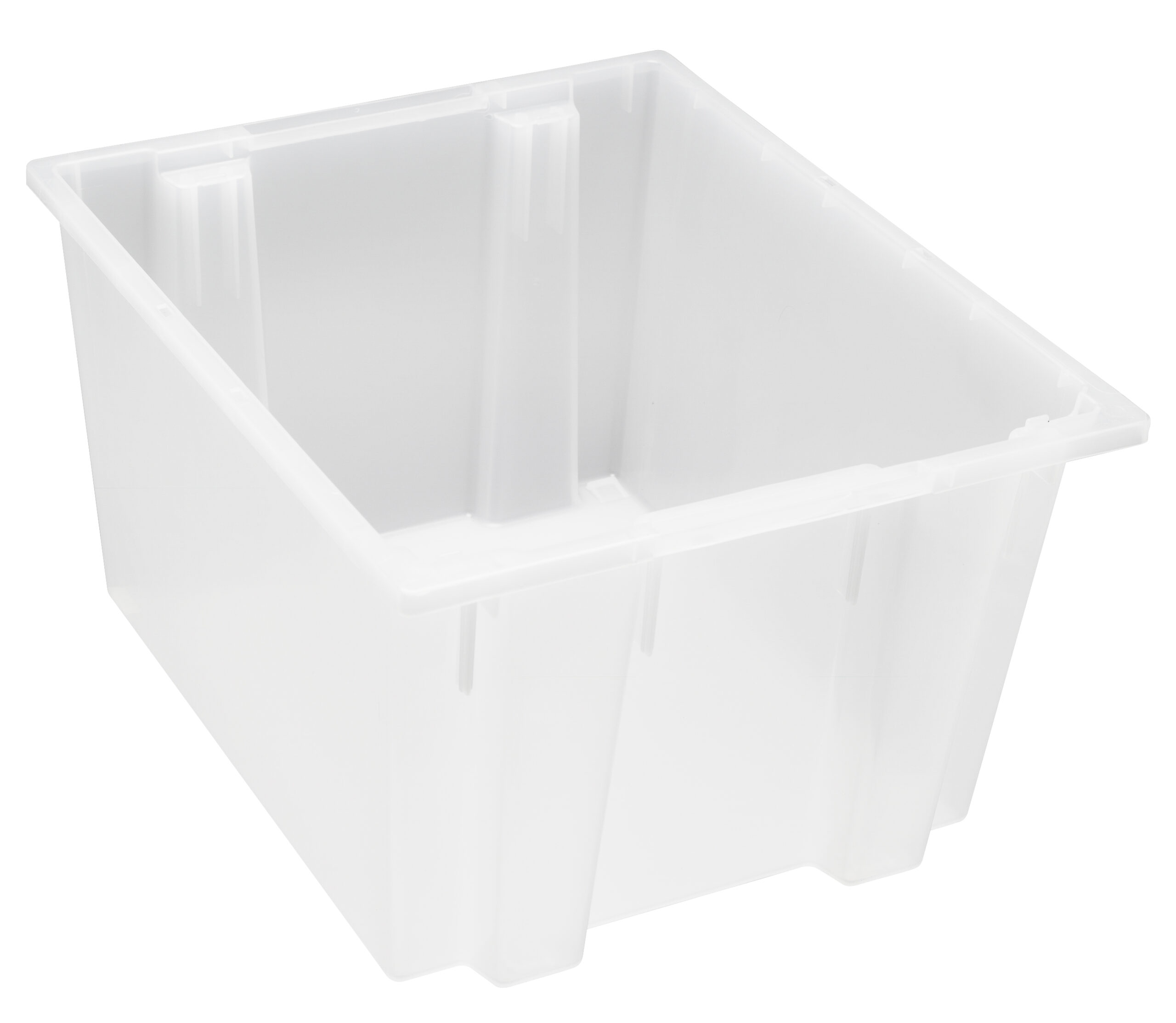 Stack and Nest Tote, 23-1/2″W x 19-1/2″D x 13″H, heavy duty, 2.60 cu. ft. capacity, clear polypropylene, Made in USA (priced per each, 3 each per carton)