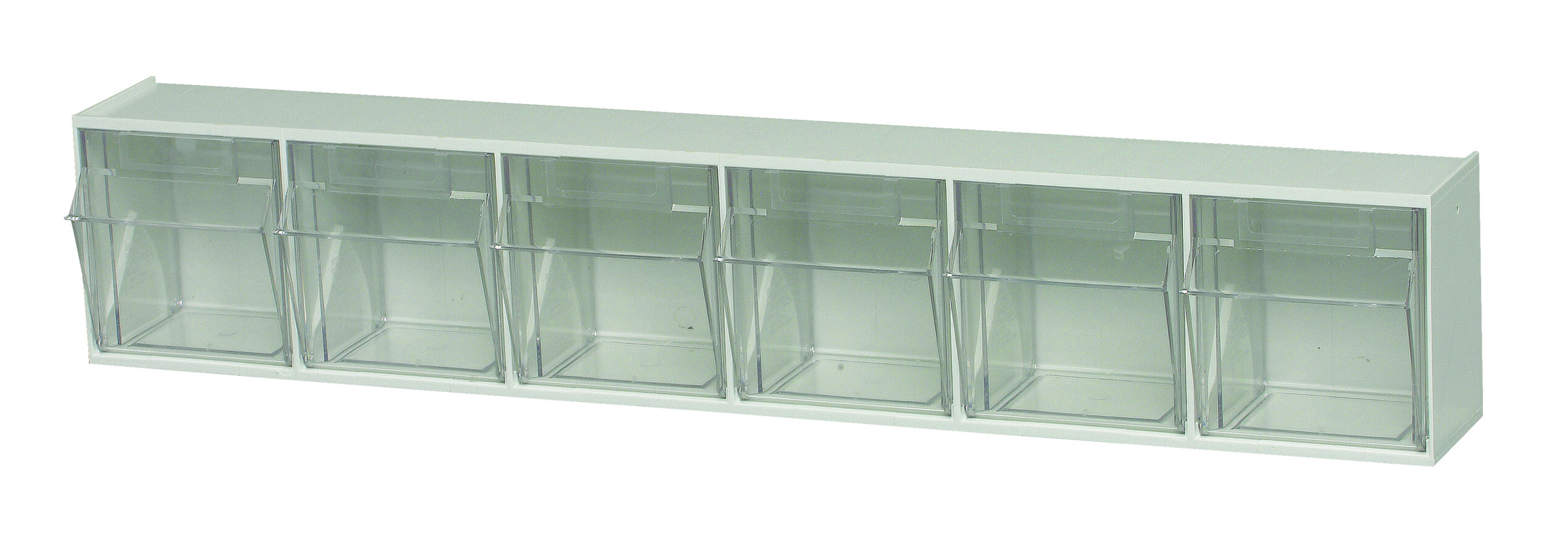 Tip Out Bin, (6) compartment, handle with label slot, opens to a 45? angle, plastic clear container, polystyrene white cabinet, Made in USA