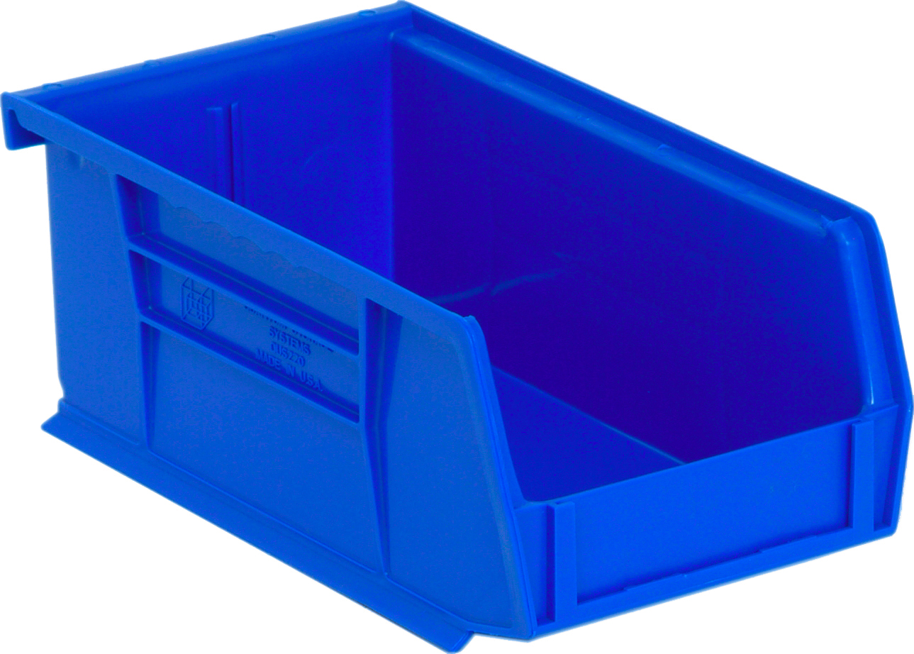 Bin, stacking or hanging, 4-1/8″W x 7-3/8″D x 3″H, front/back/side grips, anti-slide lock, (1) divider slot, rear hanger, molded-in label holder, polypropylene, blue, Made in USA
